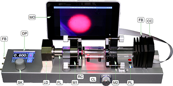 La luz del diodo láser (LD) se colima y pasa por una lente de enfoque (FL) hacia el cristal de Rubí (RC). Ambas lentes son parte integrante del diodo láser. La cavidad óptica está formada por el espejo láser plano M1 y el espejo curvo M2. Ambos espejos están montados en un soporte de ajuste que permite el ajuste de la cavidad por parte de los estudiantes.