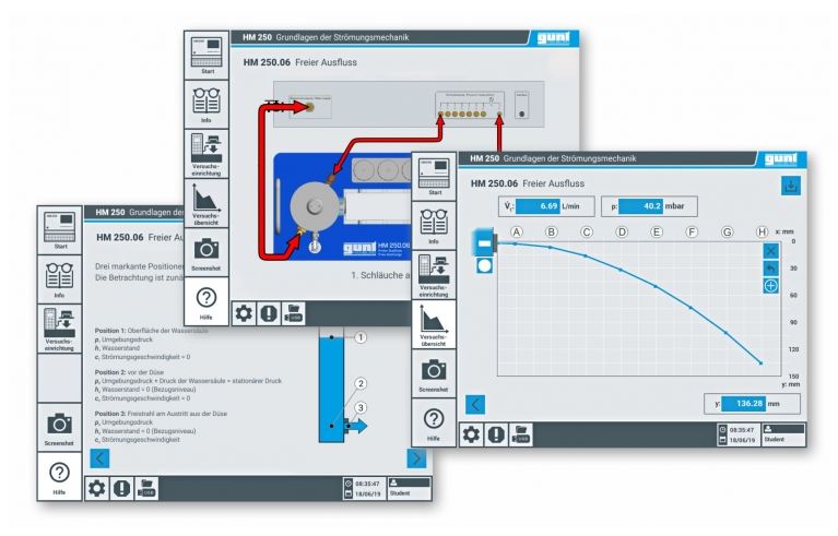 El equipo de ensayo se maneja a través de una pantalla táctil con una interfaz de usuario intuitiva. Esto incluye una preparación del ensayo guiada para conectar los elementos individuales de los accesorios, así como una purga de aire automática de las secciónes de ensayos y de las conexiones de medición de la presión. Además, se muestran módulos de aprendizaje con fundamentos teóricos para que coincidan con los temas de ensayo individuales. Para la ejecución de los ensayos se dispone de una función de ayuda que muestra la ejecución en pasos individuales. Los valores de medición se presentan en la interfaz de usuario de la pantalla táctil. Los valores de medición pueden ser transferidos a un ordenador a través de una interfaz USB y leídos y almacenados allí (p. ej., con MS Excel). Mediante un enrutador WLAN integrado, el equipo de ensayo también puede ser operado y controlado a través de un dispositivo terminal y la interfaz de usuario puede ser representada con hasta 10 dispositivos finales („screen mirroring”). Para el seguimiento y evaluación de los ensayos, se pueden utilizar simultáneamente hasta 10 estaciones de trabajo externas utilizando la red local a través de la conexión LAN.