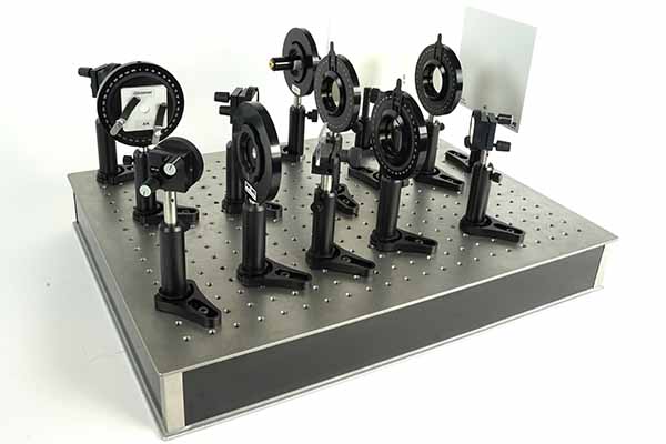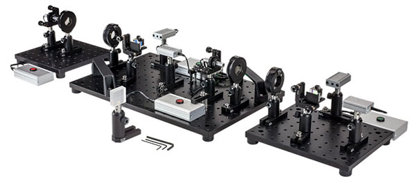 El kit incluye láseres, placas de media onda, divisores de haz y detectores para representar al emisor, al receptor y al "intruso".